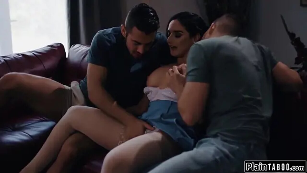 Stunning brunette MILF stepmom is shocked when her stepson and his friend suggest a threesome. She sucks their big cocks while they lick her pussy and give her deepthroat. They also dp her as she enjoys the taboo family action.
