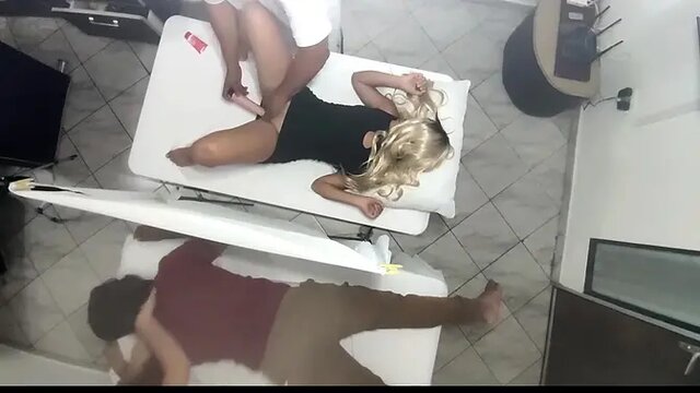 A gorgeous Latina masseuse seduces a woman next to her unsuspecting husband. She massages her, then licks and sucks on her big booty, making her husband jealous. He watches as she rides the masseuse's cock, getting a creampie while he can only look on.